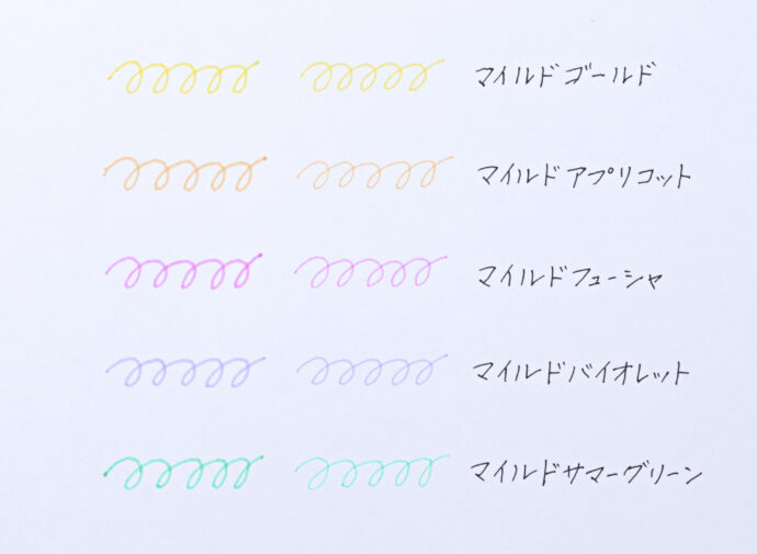 元々「おだやかな色合い」が売りの「マイルドライナー」なので、細く書ける、をリリースするとなると色選びがなかなか難しいと思うんですよね。淡すぎると読めない・見えないことになってしまうので、視認性の高い色を中心に選んだ、というのは嬉しいです。